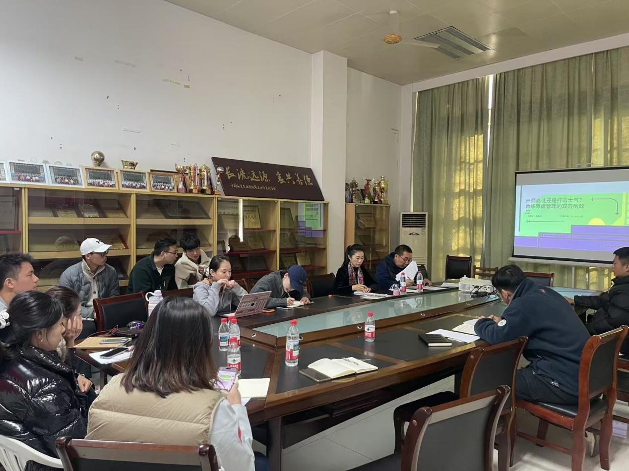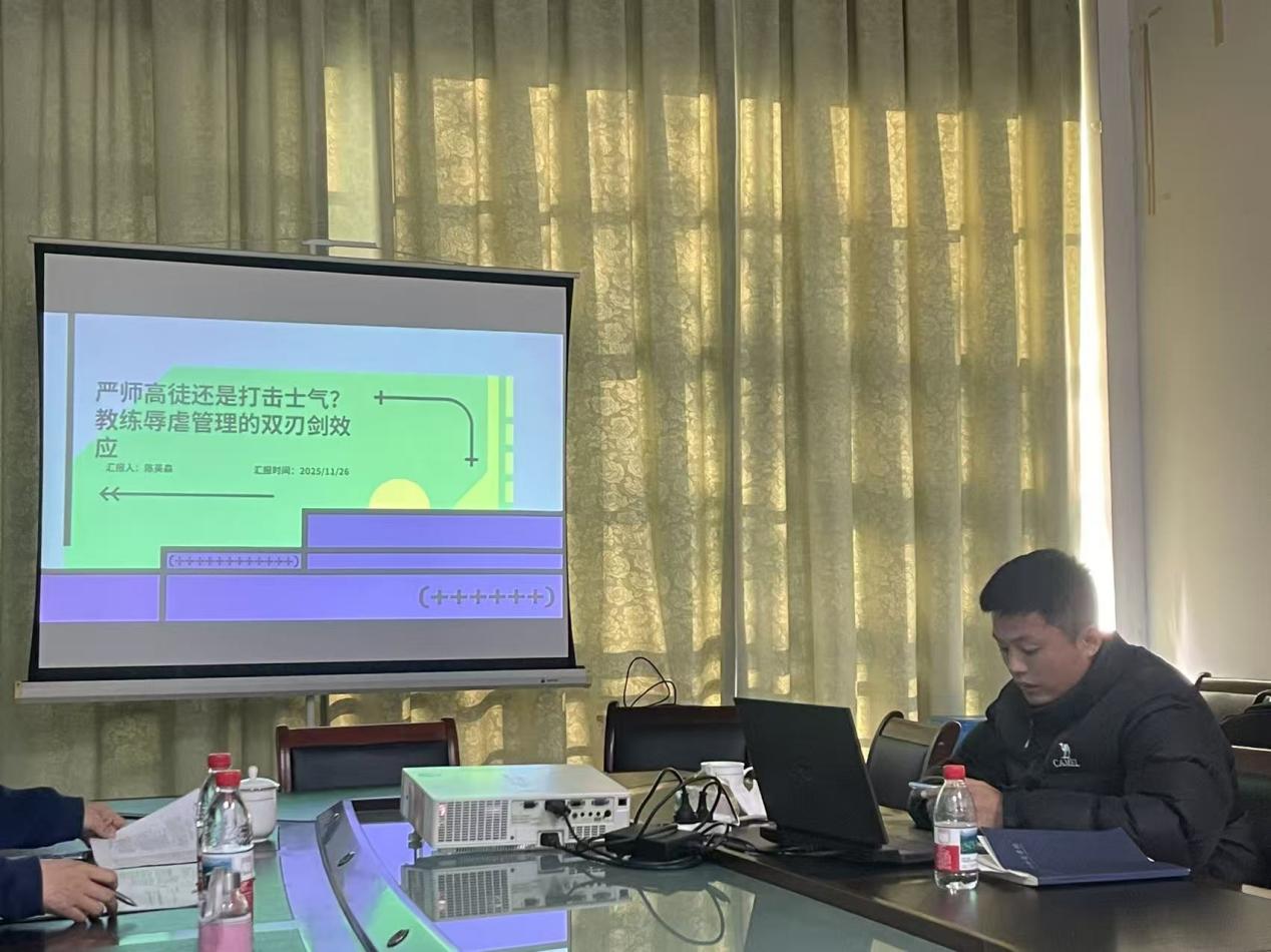 活动伊始,陈英森老师以《严师高徒还是打击士气?教练辱虐管理的双刃剑效应》为题展开分享。他结合国内外体育团队管理案例,剖析了传统"高压式"管理模式的两面性:一方面,适度严苛的要求可激发运动员潜能,塑造顽强作风;另一方面,过度辱虐式管理可能导致团队信任破裂、积极性受挫。他提出,现代体育管理应建立"严慈相济"的模式,在规则约束与人文关怀间找到平衡。分享结束后,老师们围绕"如何界定管理边界"展开讨论,李海鹏教授点评时强调:"管理的核心是激发人而非压制人,体育领域尤其需要刚柔并济的智慧。"